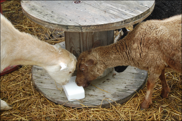 We got new saltblocks for the animals and it’s kind of funny to watch who really likes them and who could kind of care less. Buttercup and the goats really like them. They take a lick or two every time they pass by. The sheep are sort of divided. Some really like it, some just sniff and walk away. Salt is a good thing, it helps them to regulate their body temperatures and just gives them some minerals and such as well. We give free choice mineral and salt blocks. Seems like it takes them a month or two to wear one away.
