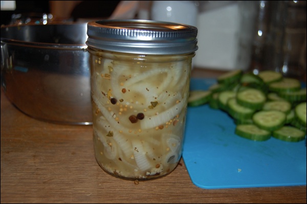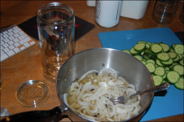 Cut and pack the pickles and onions into a clean, sterilized jar. With the remaining ingredients, place in a small saucepan and get to a boil. Once boiling, allow to cool for one minute and then pour into the jar with the pickles. Allow to cool, then seal, and slowly tip and turn to get the liquid nicely flowing through the slices. Place in the frig for at least 5 days, allowing to pickle. Then enjoy! These are not meant for canning and processing.