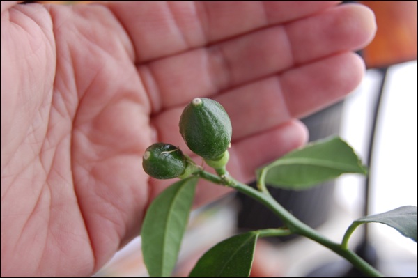 In the meanwhile, my first attempts are doing well! Two nice little lemons are growing! And they really look like little lemons now! So cool… My one plant is definately got breeding on the mind, whereas the other is simply interested in really putting on the green growth and leaves. No blooms. I wonder if there are variations in sex with these plants. I need to do a little more reading. Could I have a male and a female plant? Hmmmm….