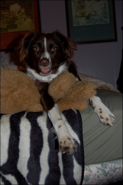 She loves Floppy Puppy and carries him all over the house, lays on him, takes him to bed with her in her crate and generally luvs him very very much.