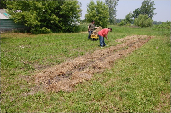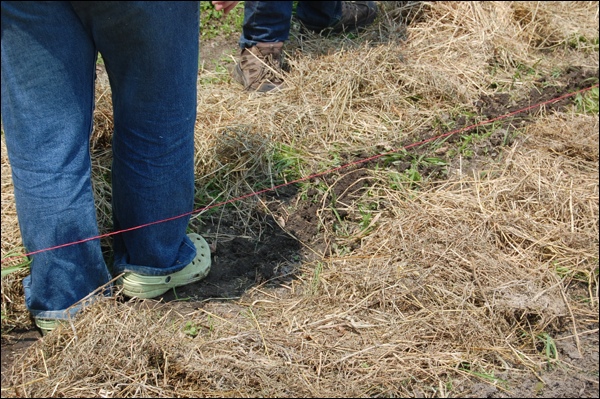 Our rows are 50 feet long and I hope to get about 7 or 8 rows in this garden area. We are putting down spoiled straw between the rows as a hopeful weed barrier. And I hope too it will compost down and help to build up the area a bit. It was tilled once, but it’s still kind of lumpy and bumpy and all. I just couldn’t afford to have it tilled again, and it’s so low out there, I think I’m going to just do my best to do a no-till compost layered garden this year. I’m definintely overplanting a great deal, so what grows, grows!