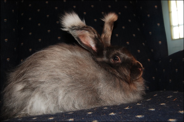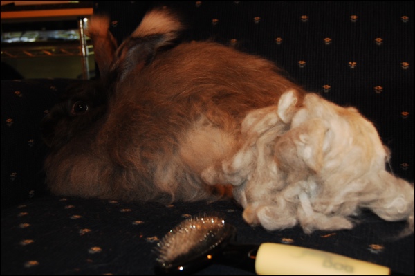Been brushing and plucking some of their wool, and saving it all for our yarn production in the spring. But I’m considering shaving them back for the summer, since it’s SO hot… still doing some thinking and reading as to whether this is the best strategy or not. We just got a awesome book called “The Nervous New Owner’s Guide to Angora Rabbits” by Suzie Sugrue and so I’m weighing in on her ideas as well as some of the good websites out there. Right now, we’re just brushing and plucking, and will probably do so for awhile since we won’t have wool from the sheep until spring.