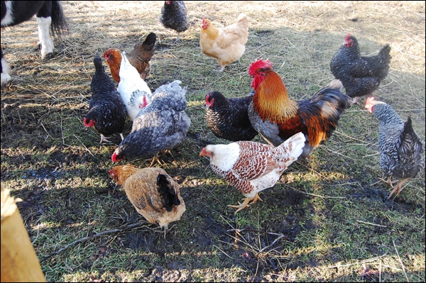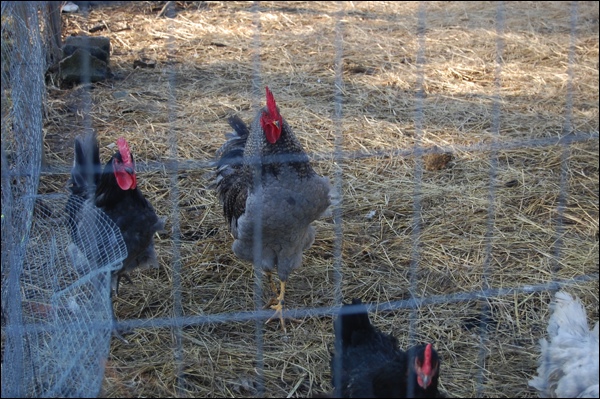 The five banties were fine with the move and have settled in nicely. The large free range flock treats them as an amuzing zoo exhibit and they gather around the isolation coop, watching and pecking through the wire at them if given a chance. The banty roos have a lot more to watch and enjoy as they watch Chicken TV all day long with Bucka and his gang coming and going in the big barn. I would let them out, but I think it would really mess up the delicate roo balance of Bucka and Copper, plus I’m worried that our friend the hawk might get the little BB Red roos… as they are still very young and small.