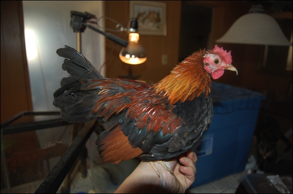 Now, the last of my rooster tale for the evening is our banty problems! Now, when I was learning about mail order eggs, I was fascinated with these mille fluer banty chickens and I ordered 18 eggs. And only two hatched and of course, they were roosters. At first we were hopeful and we named them Petunia and Daffodil. They are fluffy and very full feathered chickens. Beautiful for sure. But one day we heard Petunia crowing! So we changed his name to Pete. A week later, Daffodil started to crow, so we renamed him Repete. SO now we have Pete and Repete. When I couldn’t resist a box of 7 little BB Red English Game Banty chicks… we ended up with 4 roosters and 3 hens! Oh my… and then when 3 of the little roos decided to beat up on one of them, nearly killing their flock mate, we got Lucky, our little parrot roo. Maggie nursed him back to health, but he could not go back with the other roos or they would attack him. SO Lucky lived inside for awhile, in a big aquarium, getting so tame that he would hop out when it was time for him to get out and wander about, hopping from arm to arm and visiting. Maggie would watch tv with him sitting with her, watching away. He was awesome, that is, until he started to crow. Like every 5 minutes. All day and night.